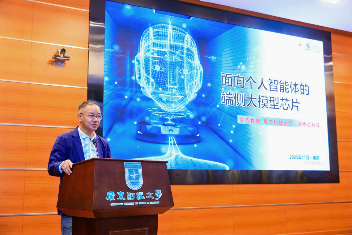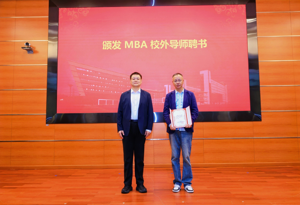 雷宇在致辞中对各位嘉宾的到来表示热烈欢迎和衷心感谢。他指出,当前正值深入学习贯彻党的二十届四中全会精神、谋划“十五五”发展蓝图的关键时期,加快发展新质生产力、推动数字经济创新发展是重要任务。本期大讲堂聚焦人工智能前沿技术与产业应用,是学校服务国家战略、促进产学研深度融合的重要举措。他期望通过此次活动,为师生和粤商企业家把握AI时代机遇、推动产业智能化转型提供宝贵启示。 随后,雷宇为深圳市迈特芯科技有限公司创始人、南方科技大学余浩教授和深圳市龙岗数据集团外部董事应俊先生颁发了广东财经大学MBA校外导师聘书。