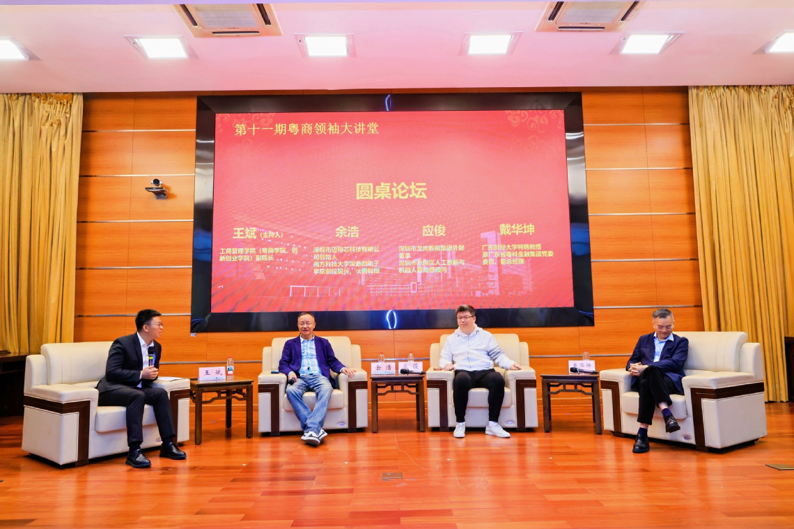 余浩教授以“AI芯片驱动个人智能体革命:粤商创新引领数字未来”为题作主题报告,深入浅出地介绍了AI芯片在边缘计算等领域的突破性进展及产业化前景。应俊先生围绕“AI大模型引爆产业革新:从爆款应用到百业智变”分享了AI大模型在教育、政务、金融、制造等行业的丰富实践案例与落地思考。在随后的圆桌论坛环节,余浩、应俊、戴华坤围绕“AI赋能粤商高质量发展的新赛道与新场景”与现场师生、企业家展开了深入交流与讨论,现场气氛热烈。